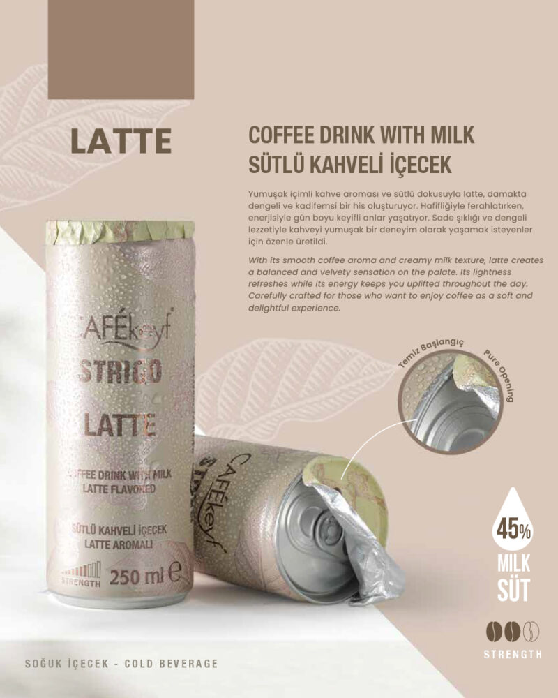 Yumuşak içimli kahve aroması ve sütlü dokusuyla latte, damakta dengeli ve kadifemsi bir his oluşturuyor. Hafifliğiyle ferahlatırken, enerjisiyle gün boyu keyifli anlar yaşatıyor. Sade şıklığı ve dengeli lezzetiyle kahveyi yumuşak bir deneyim olarak yaşamak isteyenler için özenle üretildi.