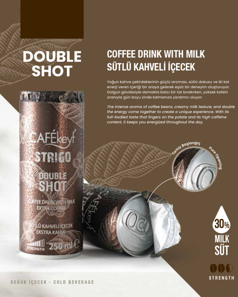 Yoğun kahve çekirdeklerinin güçlü aroması, sütlü dokusu ve iki kat enerji veren içeriği bir araya gelerek eşsiz bir deneyim oluşturuyor. Dolgun gövdesiyle damakta kalıcı bir tat bırakırken, yüksek kafein oranıyla gün boyu zinde kalmanıza yardımcı oluyor.