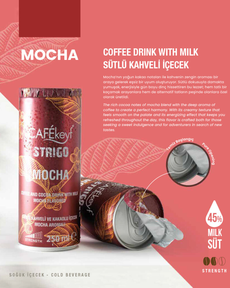 Mocha'nın yoğun kakao notaları ile kahvenin zengin aroması bir araya gelerek eşsiz bir uyum oluşturuyor. Sütlü dokusuyla damakta yumuşak, enerjisiyle gün boyu dinç hissettiren bu lezzet; hem tatlı bir kaçamak arayanlara hem de alternatif tatların peşinde olanlara özel olarak üretildi.